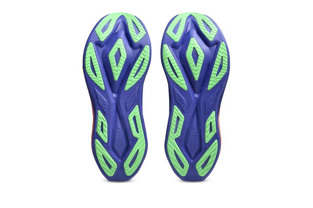 Die Außensohle des ASICS Superblast 3 (unisex) nutzt abriebfestere Elemente im Vorfuß und an der Ferse, die in die trampolin-artige Pod-Struktur eingebettet sind. Diese Konstruktion verbessert den Toe-off und sorgt gleichzeitig für Traktion und Haltbarkeit auf Asphalt und befestigten Wegen.